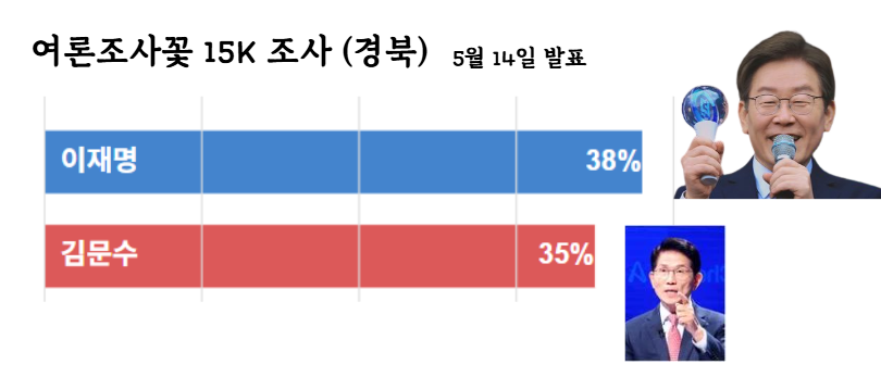 대구 시 안에서는 아직 김문수가 앞서 있답니다. 하지만 대구를 제외한 경북 전지역에서는 이재명 38% 대 김문수 35%로, 즉 오차범위 밖으로 이재명이 앞섰다고 합니다.