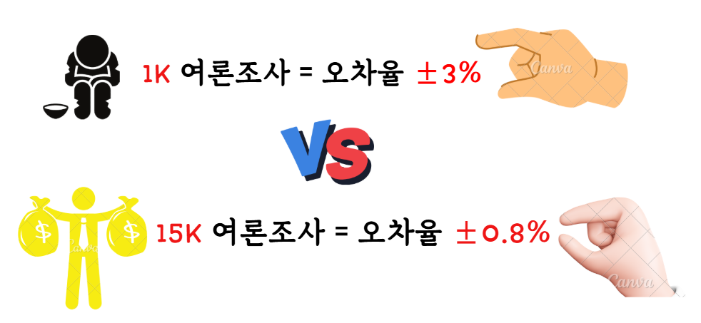 그래서 1천명 대 여론조사의 오차율이 ±3%포인트 대이지만(위아래로 3% 정도는 틀릴 수 있음),